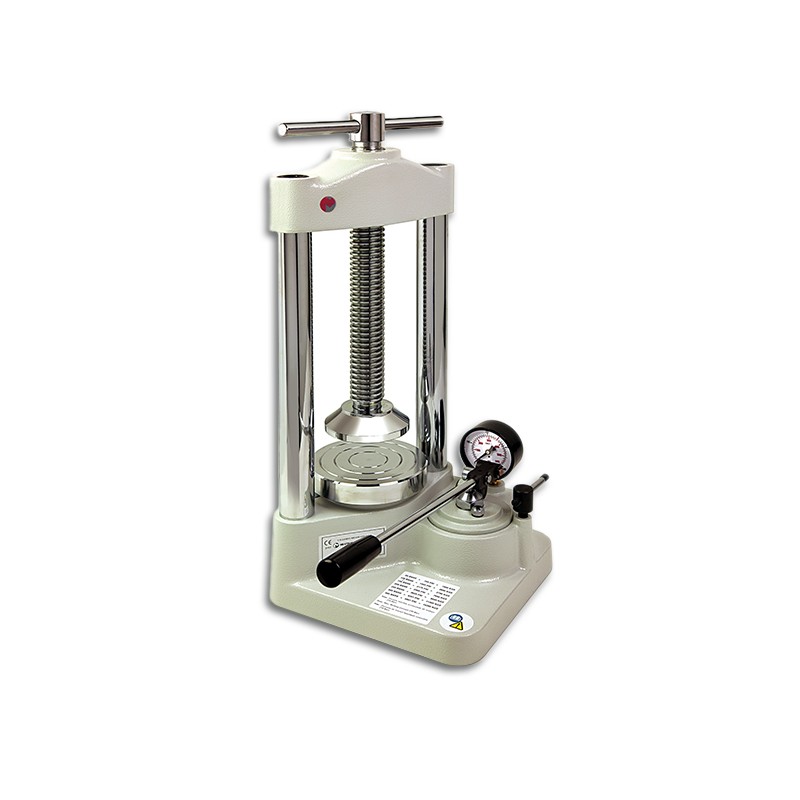 The MESTRA hydraulic press is sturdy, elegantly designed, and easy to handle. It is built following the latest standards and made from innovative materials.The hydraulic system is engineered to prevent any oil leakage from the chamber.Wear-prone components are made of hardened and ground steel.Finished with epoxy paint.The press is fitted with springs that automatically return the lower plate to its initial position after use.The space between columns and the diameter of the upper plate allow easy insertion and removal of flasks with the MESTRA R-030380 press clamp, without having to adjust the spindle—saving time and increasing convenience.Technical specifications:Height (spindle down): 510 mmWidth: 225 mmDepth (without lever): 230 mmUpper plate diameter: 125 mmWorking space:Height: 235 mmWidth: 140 mmWeight: 20 kgMaximum piston stroke: 25 mmMaximum admitted pressure: 15,200 kg (400 kg/cm²)Recommended max pressure: 9,500 kg (250 kg/cm²)